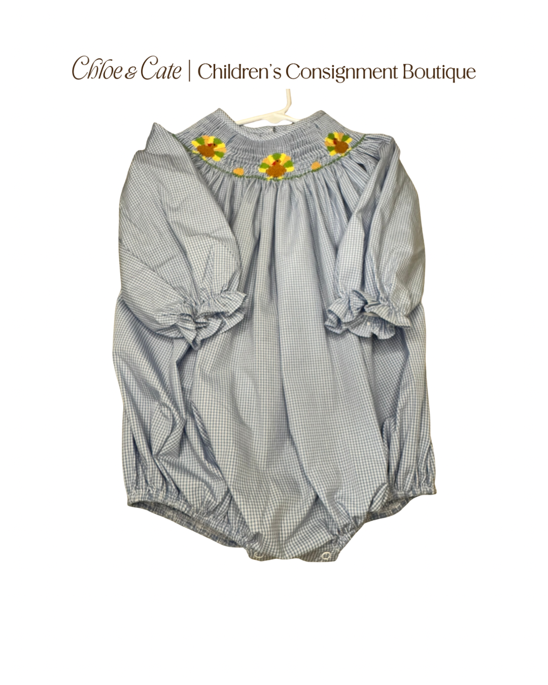 Adorable Stitchy Fish turkey smocked bubble for girls size 3T. Very good used condition. Perfect for fall and Thanksgiving. Shop quality children's clothing at Chloe & Cate.