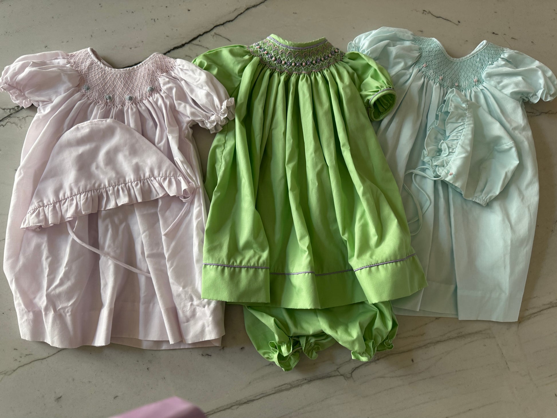 3 outfits, 2 matching bonnets.